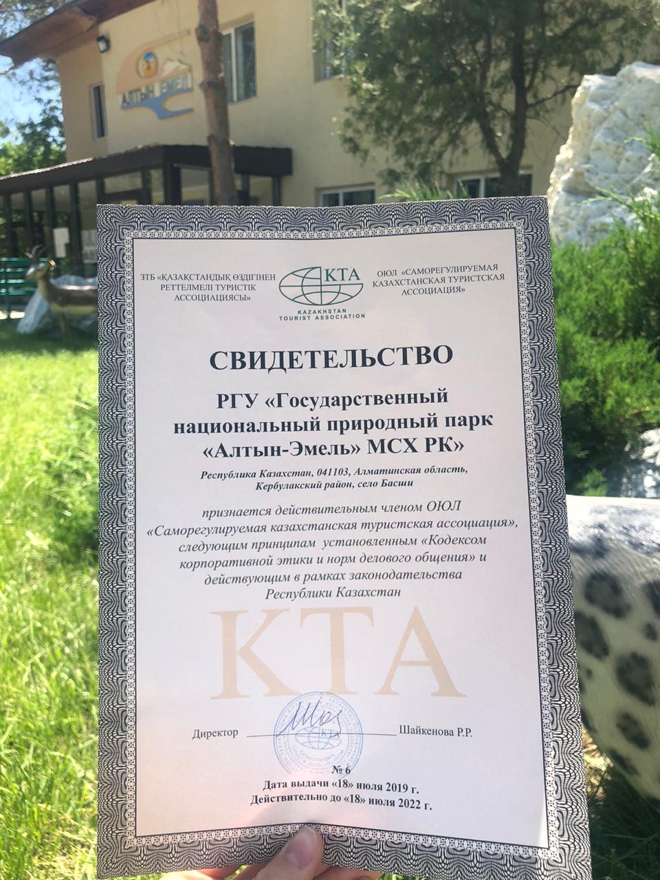 "Алтын - Емел" мемлекеттік ұлттық табиғи паркі ЗТБ " Қазақстан өздігінен реттелмелі туристік ассоциациясының" нақты мүшесі болып танылады.