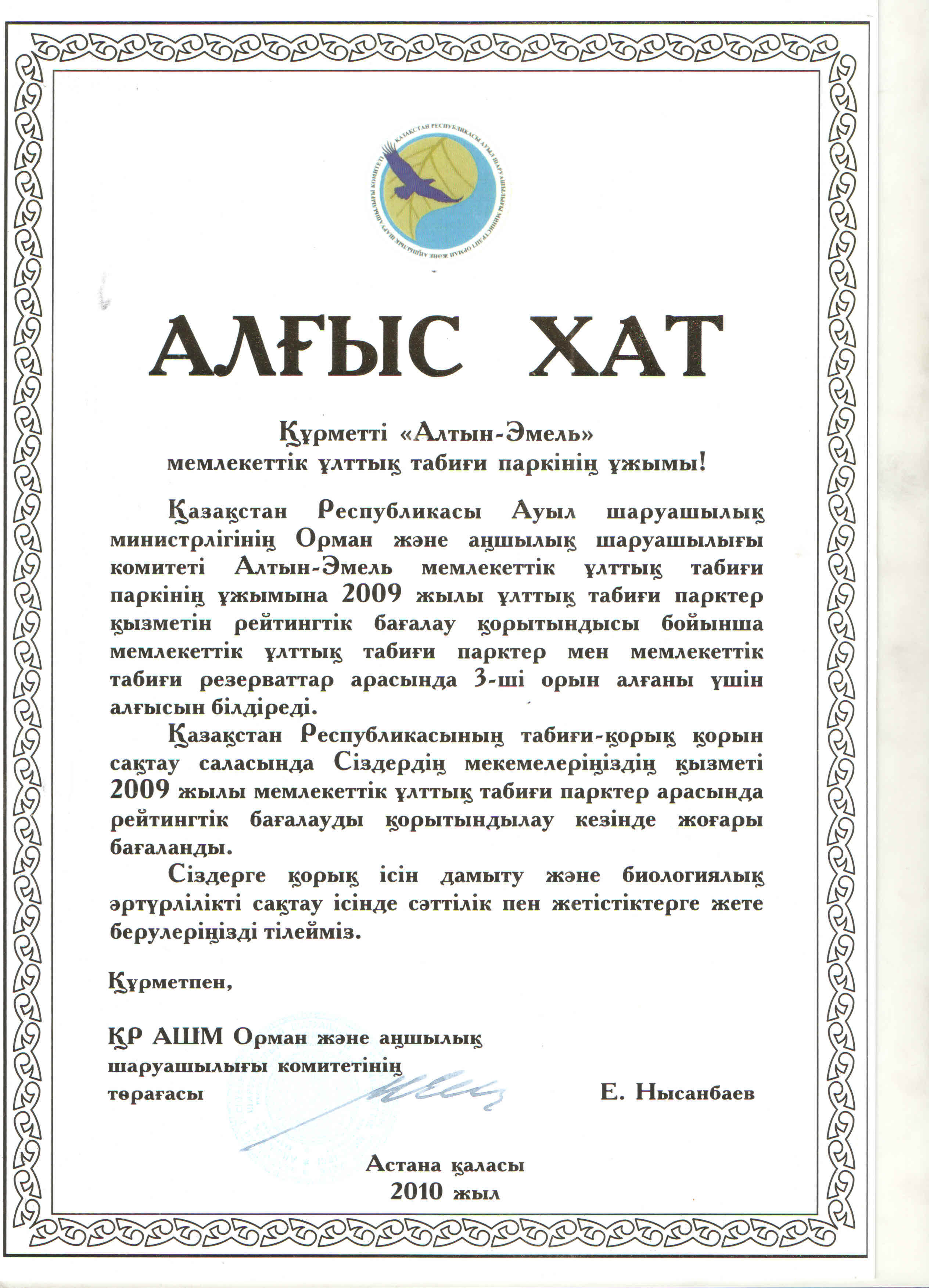 2009 жылы мемлекеттік ұлттық табиғи парктер мен мемлекеттік табиғи резерваттар арасында рейтингтік бағалаудан 3 орын алғаны үшін