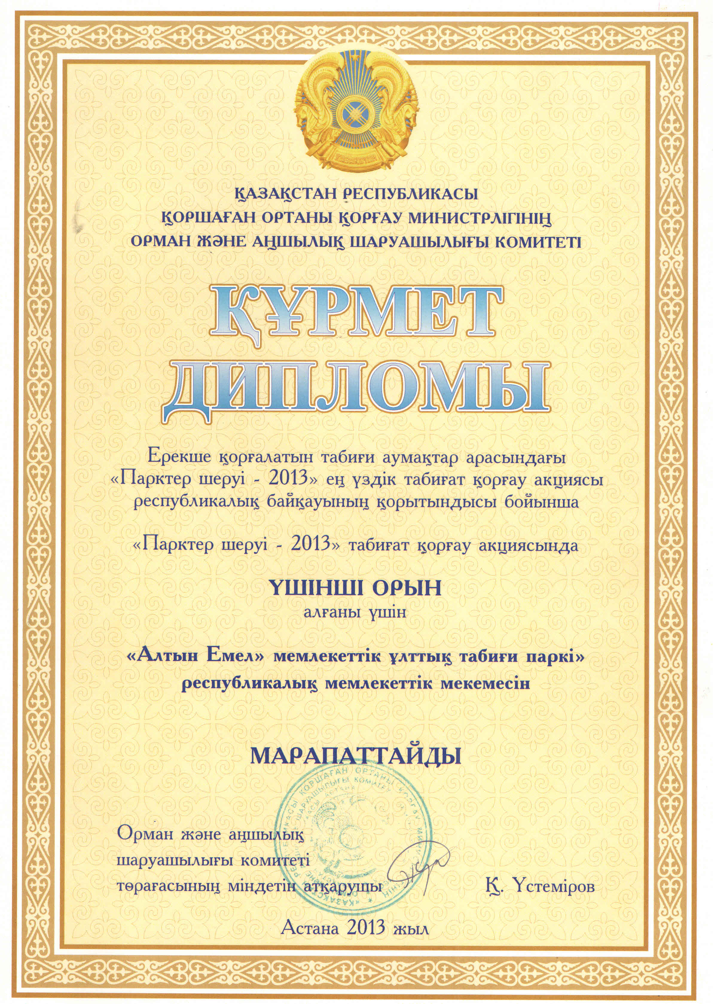 2013 жылы «Парктер шеруі -2013» табиғат қорғау акциясында 3 орын алғаны үшін Құрмет дипломымен марапатталды.