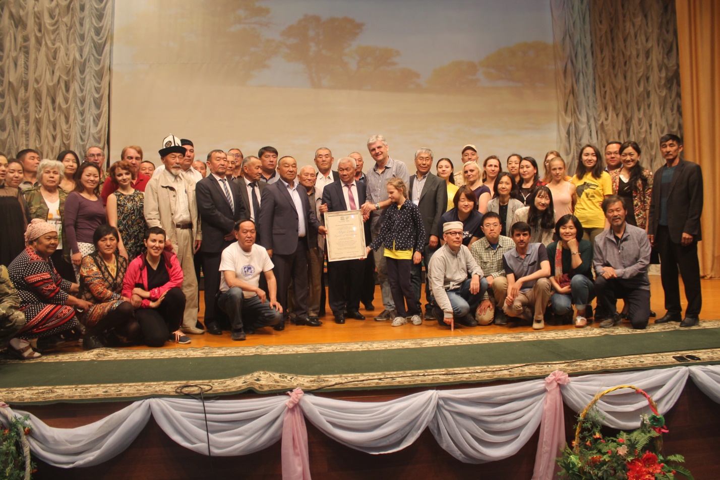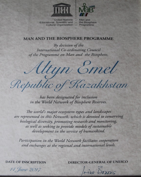 ЮНЕСКО делегациясының, жергілікті тұрғындар мен «Алтын-Емел» МҰТП қызметкерлерінің кездесуі, «Алтын-Емел» МҰТП-ға ЮНЕСКО-ның биосфера аймағының халықаралық мәртебесін беру туралы куәлік ұсынуда.