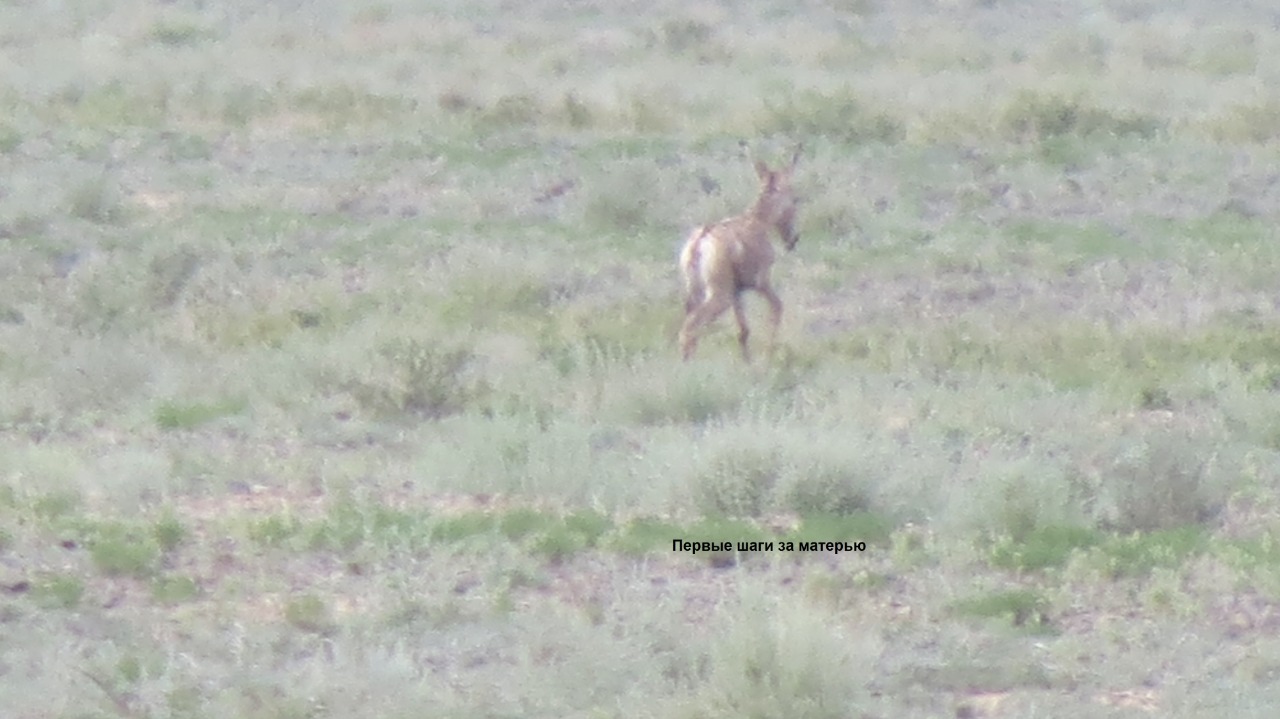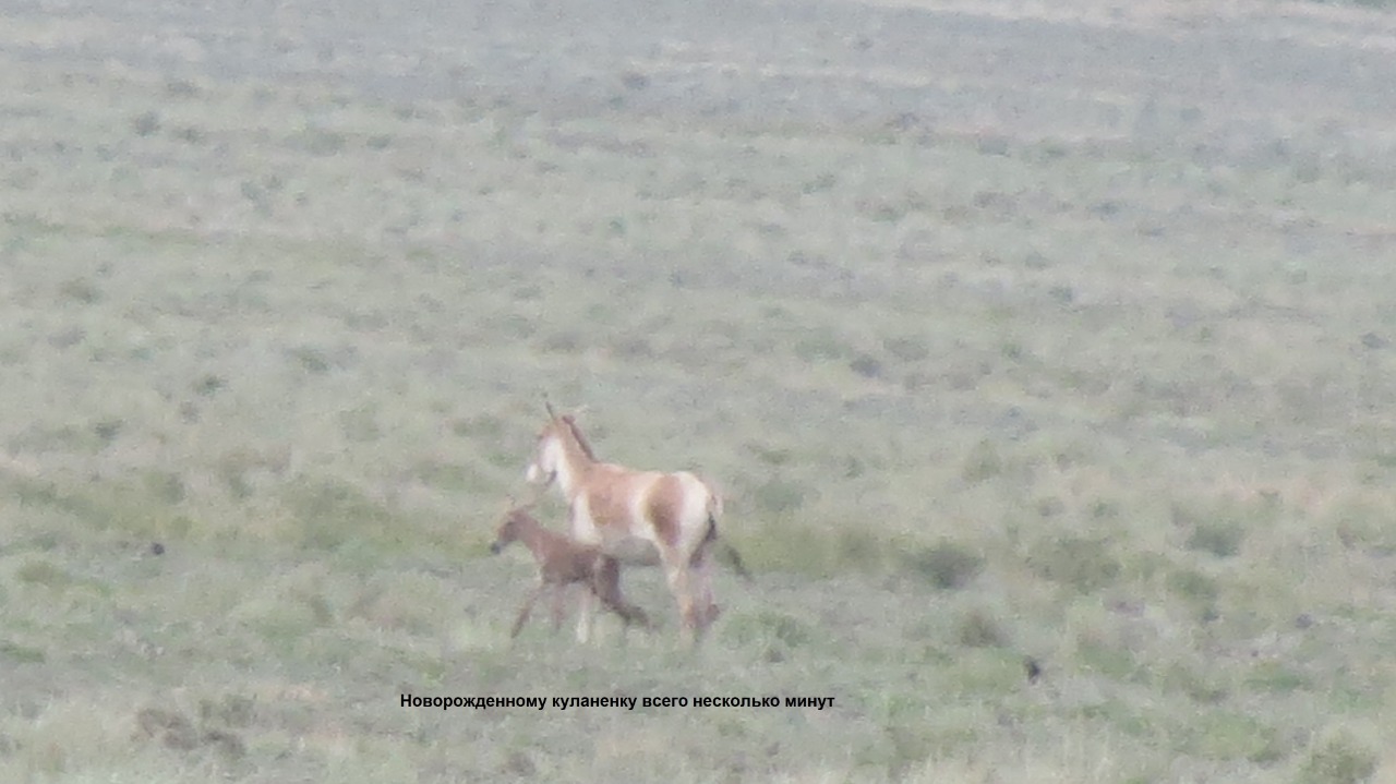 Теплая весна способствовала не только раннему весеннему перелету водоплавающих птиц, но и более раннему отелу куланов национального парка в 2020 году. Перед отелом беременные кобылы собираются в самочьи стада и держатся поодаль от общего стада. 20 апреля в районе Жантогая зафиксированы первые новорожденные куланята. Однако куланы более осторожны, чем джейраны и не подпускают к себе ближе 500-700 метров. С дальнего расстояния удалось получить редкий снимок куланенка, которому всего несколько минут жизни. Однако 5-10 минут куланенку достаточно, чтобы встать и на ковыляющих ножках поспевать за матерью.
