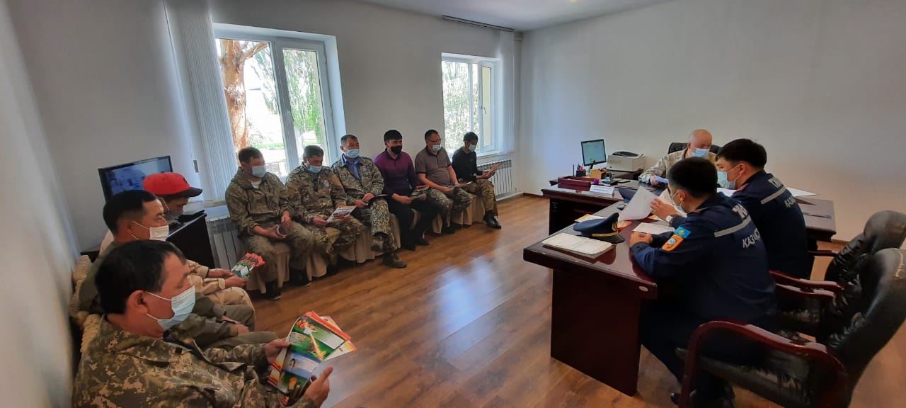 После этого совместно с представителями ЧС района, ДПД Басшийского сельского округа и работниками ГНПП «Алтын-Эмель» были проведены практические учения по тушению пожаров на местности.